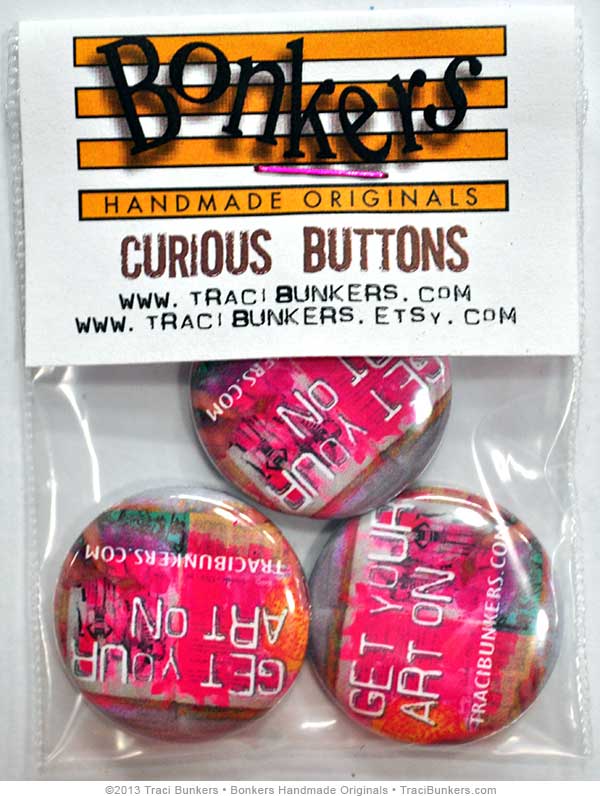 Click image to see it larger.These are fun buttons that I designed when I decided to do a 30 Days of "Get Your Art on" challenge on my blog--which is 30 days of making art every day. You can share them with friends, or put them on your apron or bag. The background is me painting a spread in one of my journals.