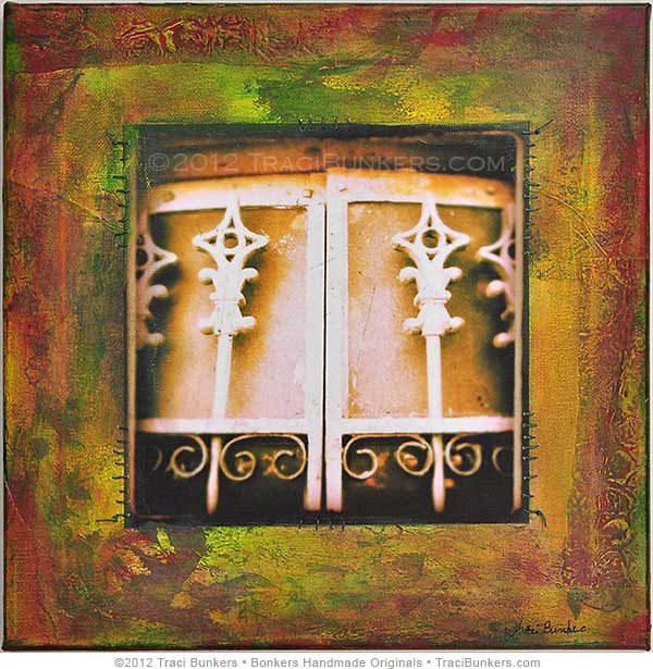 This is an original mixed-media painting that combines collage, one of my original photographs printed on canvas, waxed linen, and acrylic paint on canvas; sealed with polymer varnish.